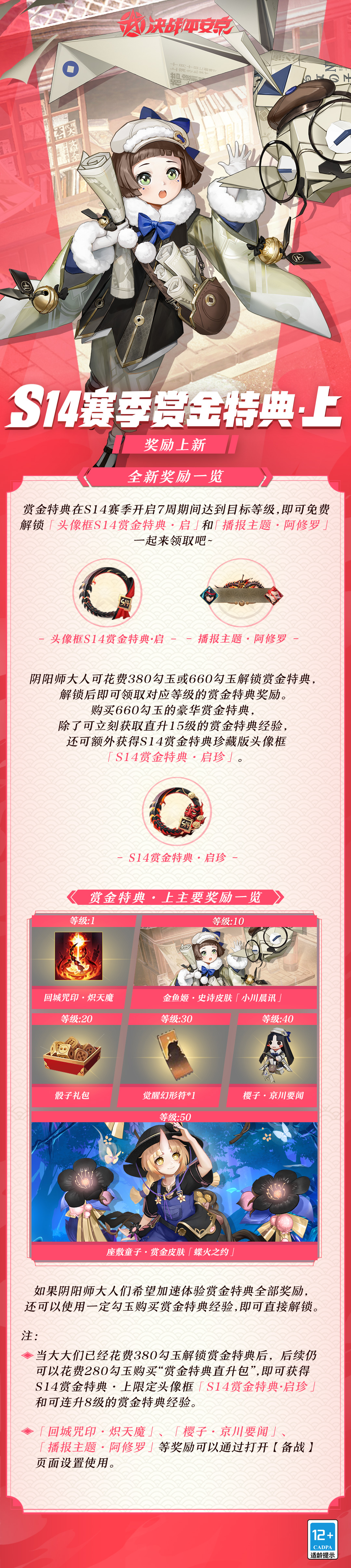 平安京即将迎来S14赛季,赏金特典同步开启!全新的赏金特典专属皮肤、赛季皮肤·赏金版、回城特效、播报主题、樱子皮肤等丰富奖励光速来袭!